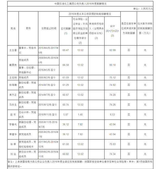 同時,對於中石化集團公布數據,與中國石化股份公司2016年年報披露數據的差異,上述負責人解釋稱,後者的薪酬數據是自然年(2016年1月1日至12月31日)的数字;而前者公布的數據,則是2016年工資財年的数字,兩者在時間上略有差異,因此造成數據的不一致。