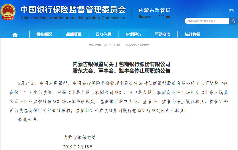 內蒙古銀保監局關於包商銀行股份有限公司股東大會、董事會、監事會停止履職的公告