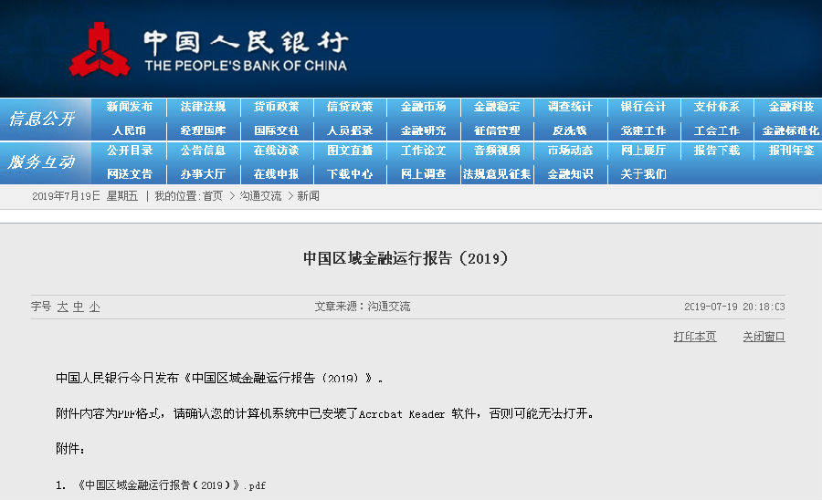 央行7月19日發布《中國區域金融運行報告(2019)》,報告指出,2019年,央行將緊緊圍繞服務實體經濟、防控金融風險、深化金融改革三項任務,創新和完善金融宏觀調控,深化金融供給側結構性改革,調整優化金融體繫結構,不斷改進金融服務。