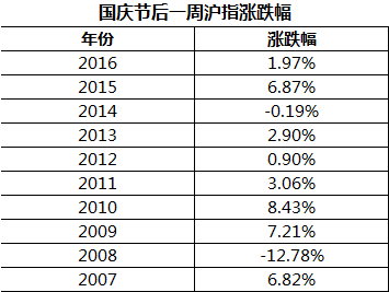 不過,國慶節後市場表現一般都明顯較好。觀察過去十年國慶節后滬指一周走勢情況,滬指上漲概率達80%,平均漲幅達2.47%。