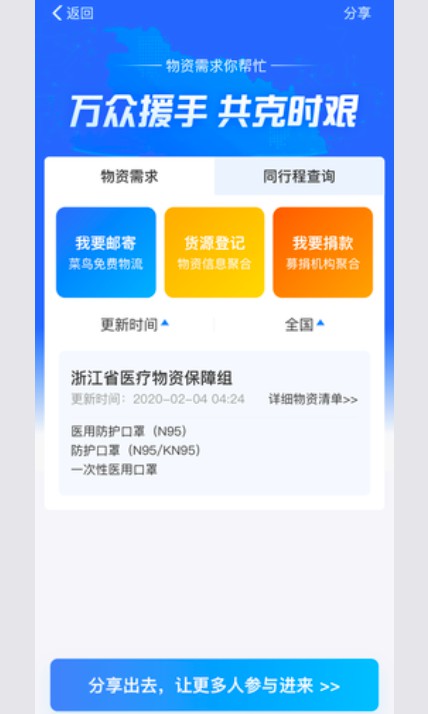 2月7日消息,《電商報》獲悉,支付寶方面表示,近日該平台上線了防疫物資信息服務平台,通過搜索同行程查詢功能即可看到。有別於其他物資信息平台,該平台利用螞蟻區塊鏈技術,由浙江省衛建委、經信廳主導,將對物資的需求、供給、運輸等環節信息進行審核並上鏈存證。同時,支付寶還向疫情相關小程序開發者提供區塊鏈算力永久免費、專項資金支持。