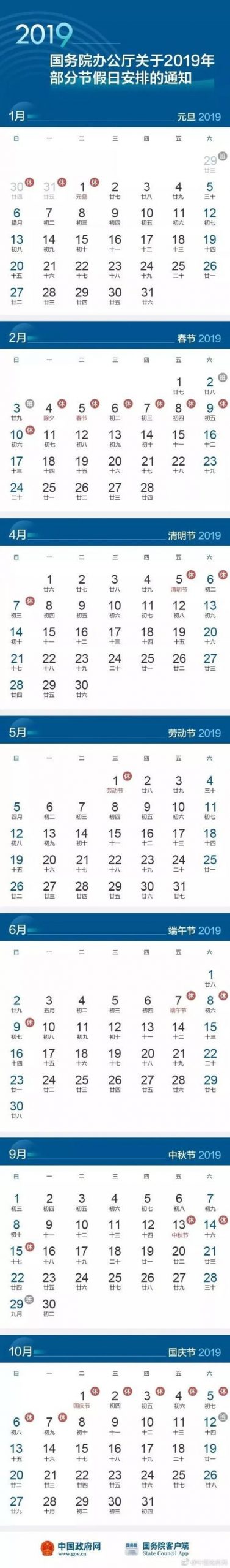 國務院辦公廳今日發布關於2019年部分節假日安排的通知,具體如下: